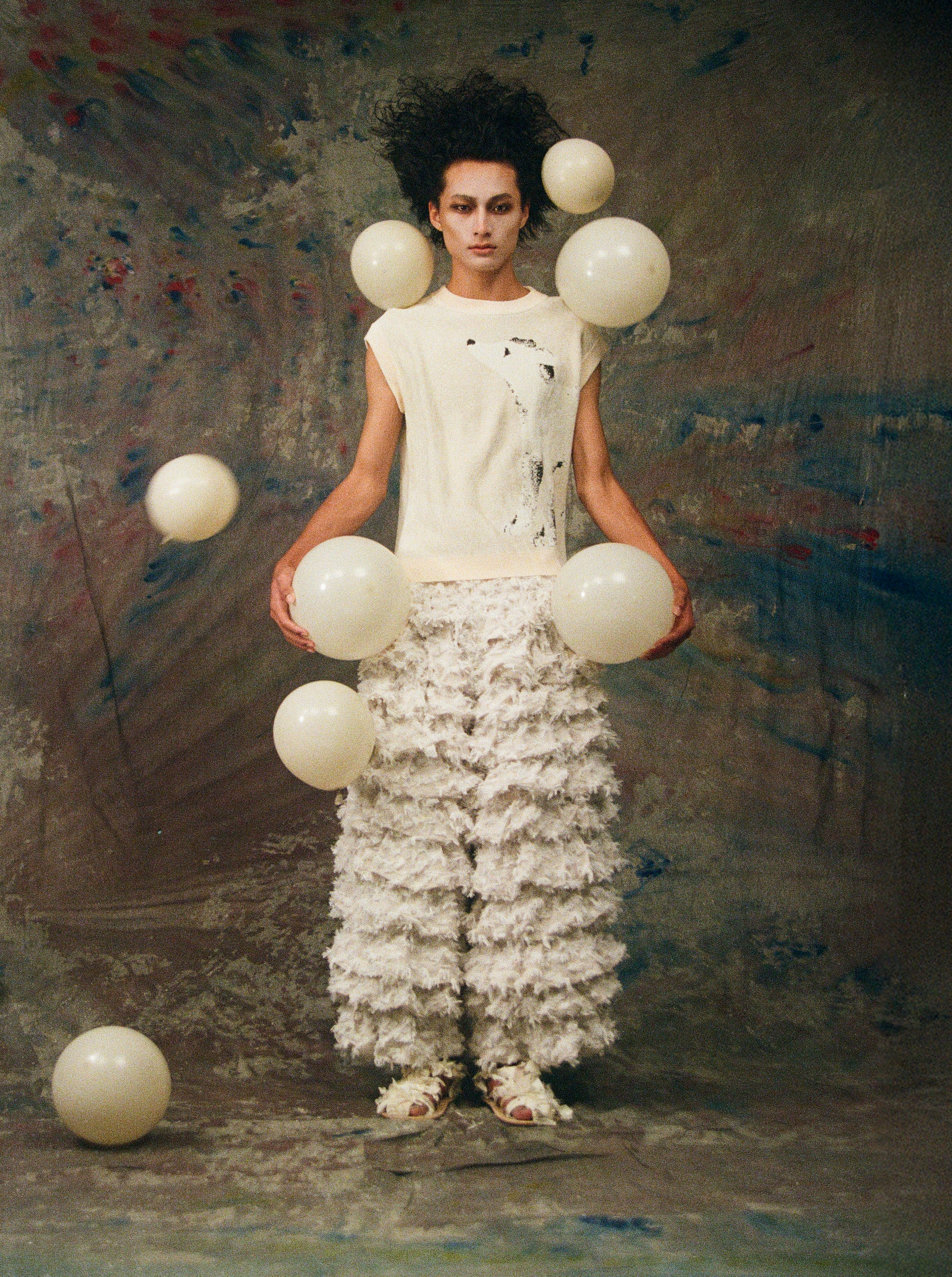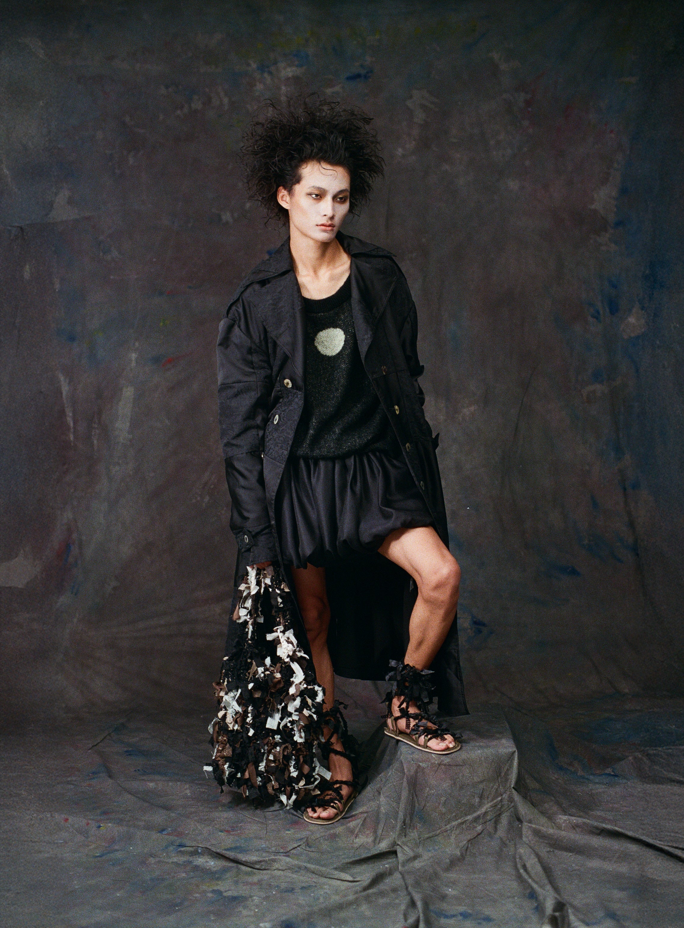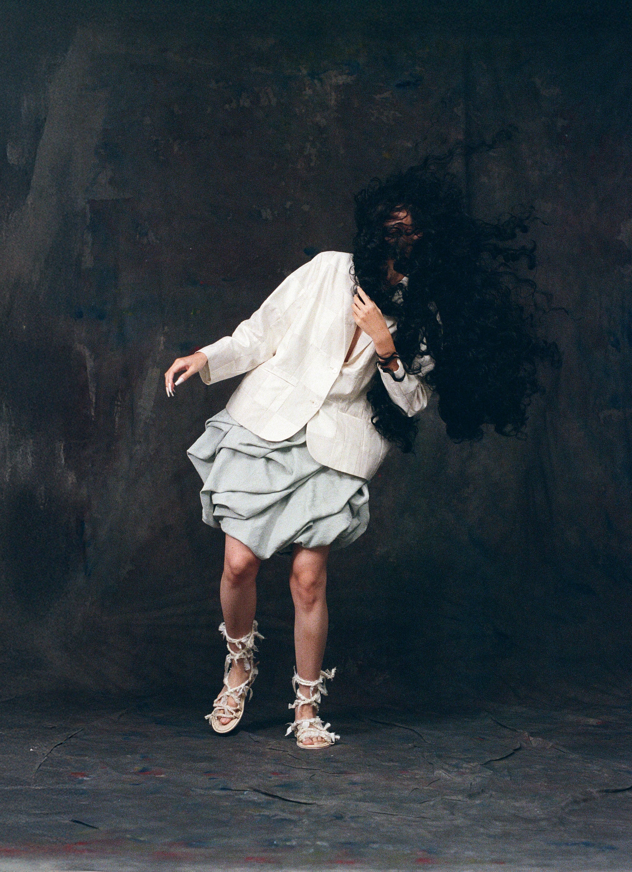 Tidal Reverie draws inspiration from coastlines, shifting tides, and luminous, wet surfaces. Through pleats, layered constructions, and semi-transparent forms, the garments portray the body drifting between light and shadow.