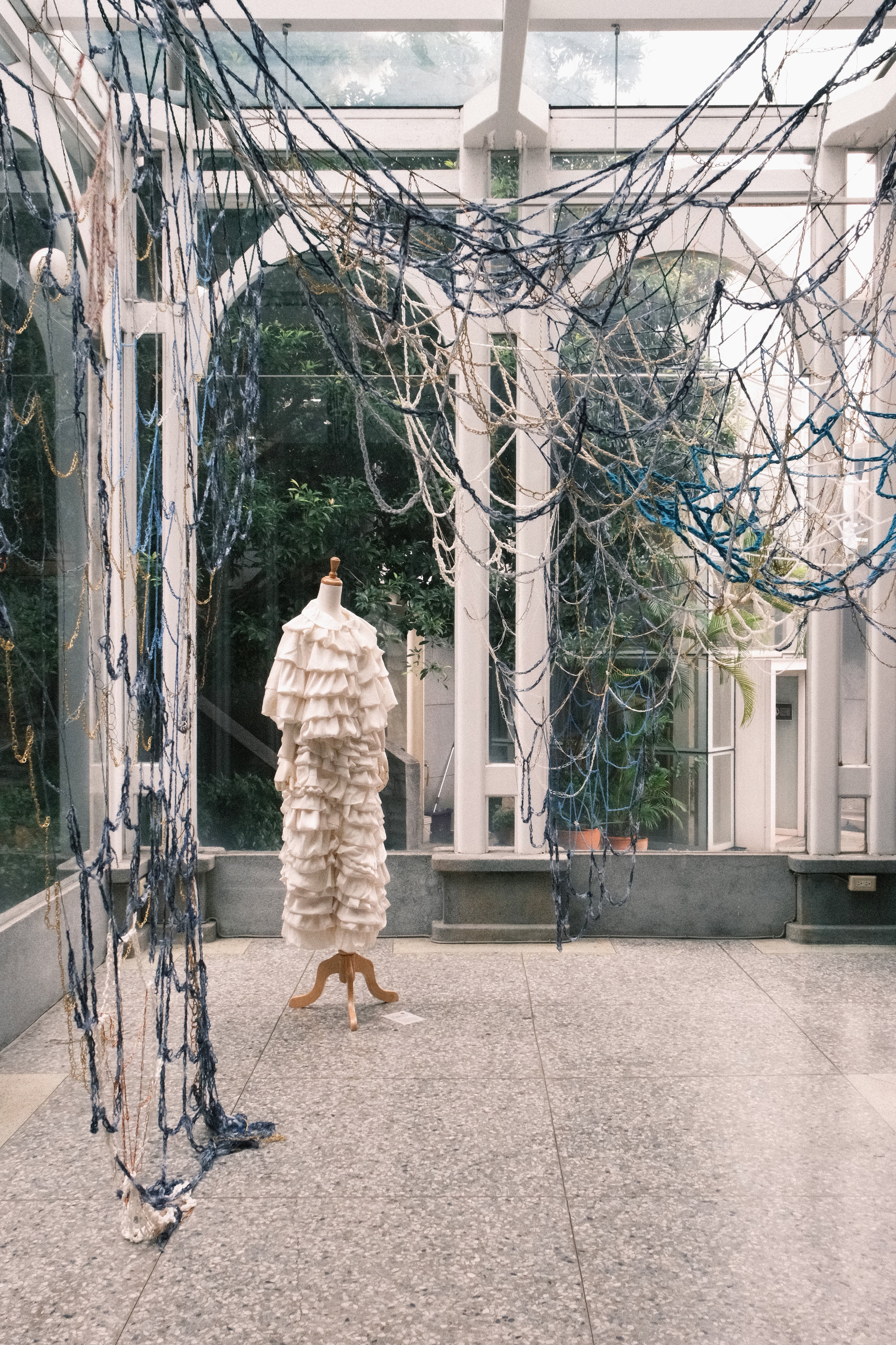 -Crocheted, net-like installations suspended in the glass room resemble tidal traces.