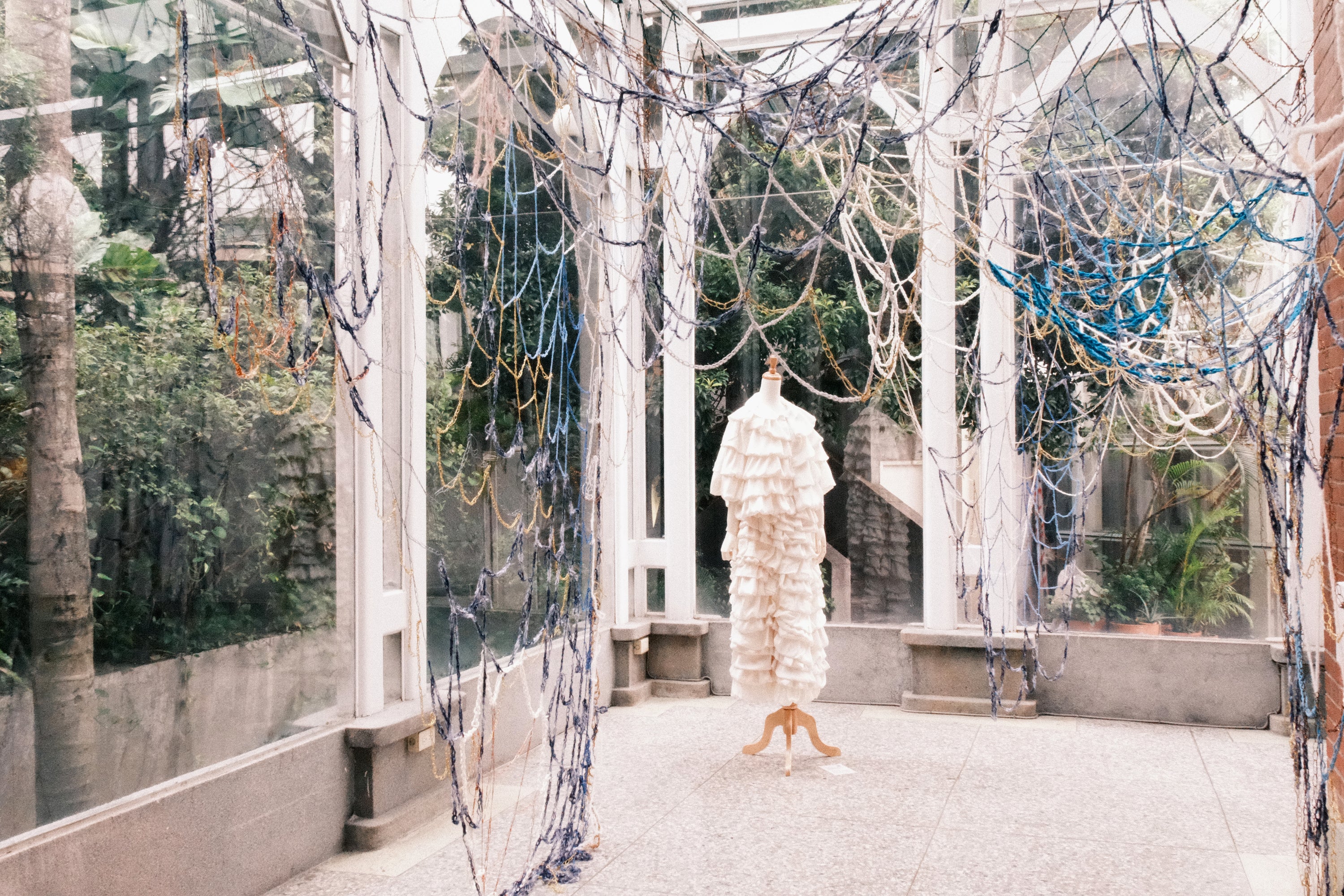 -玻璃屋中的鉤織網狀裝置如同潮痕。