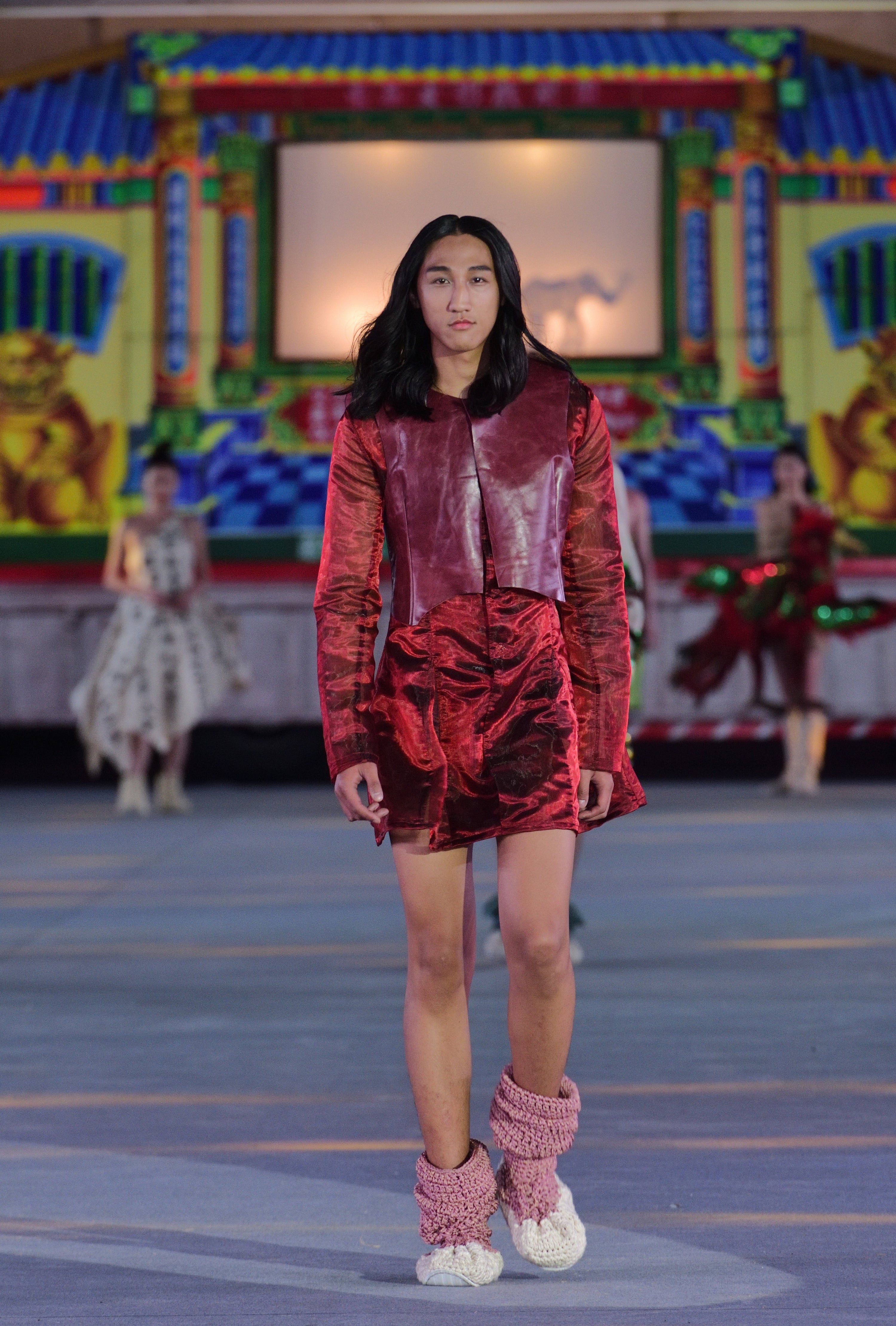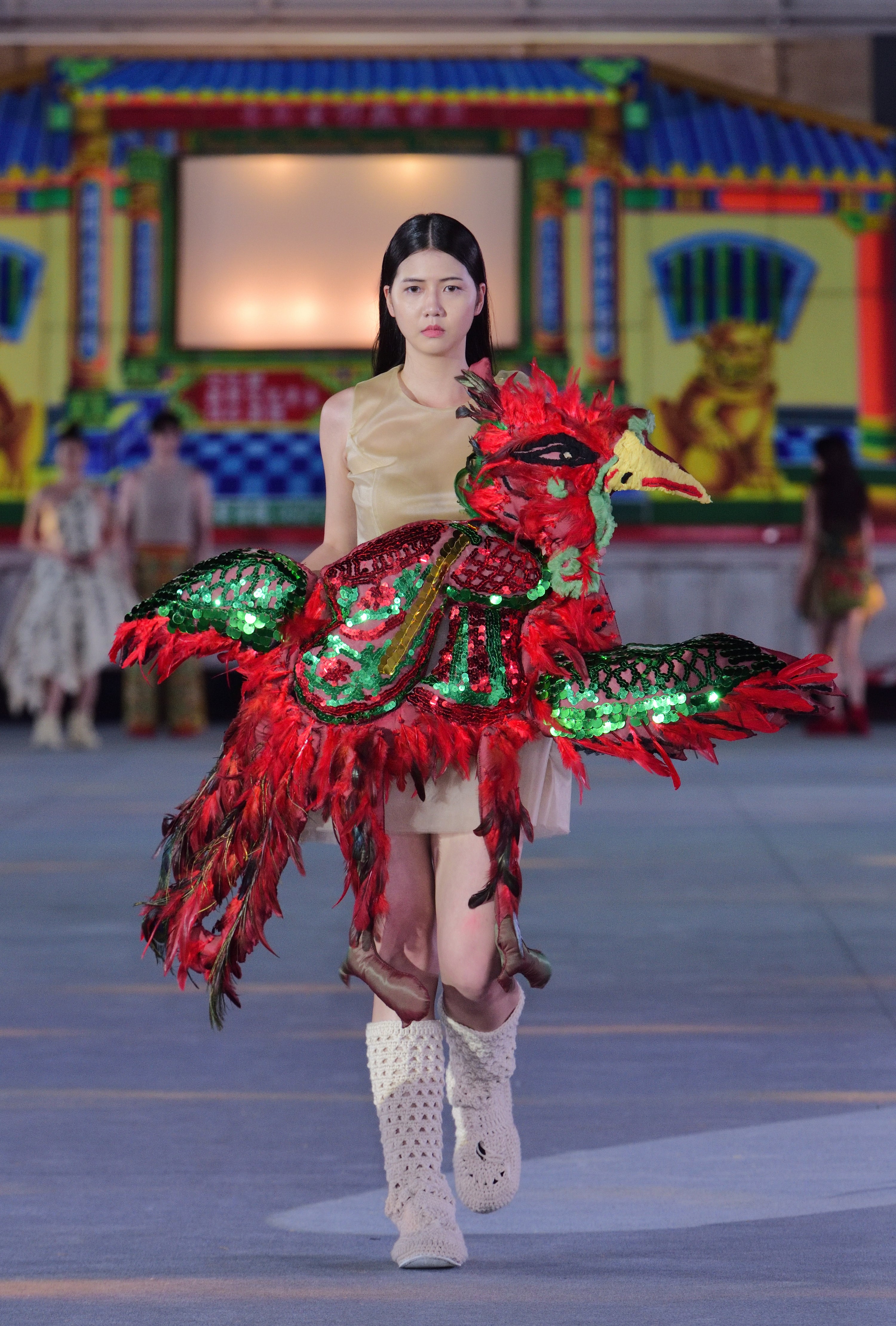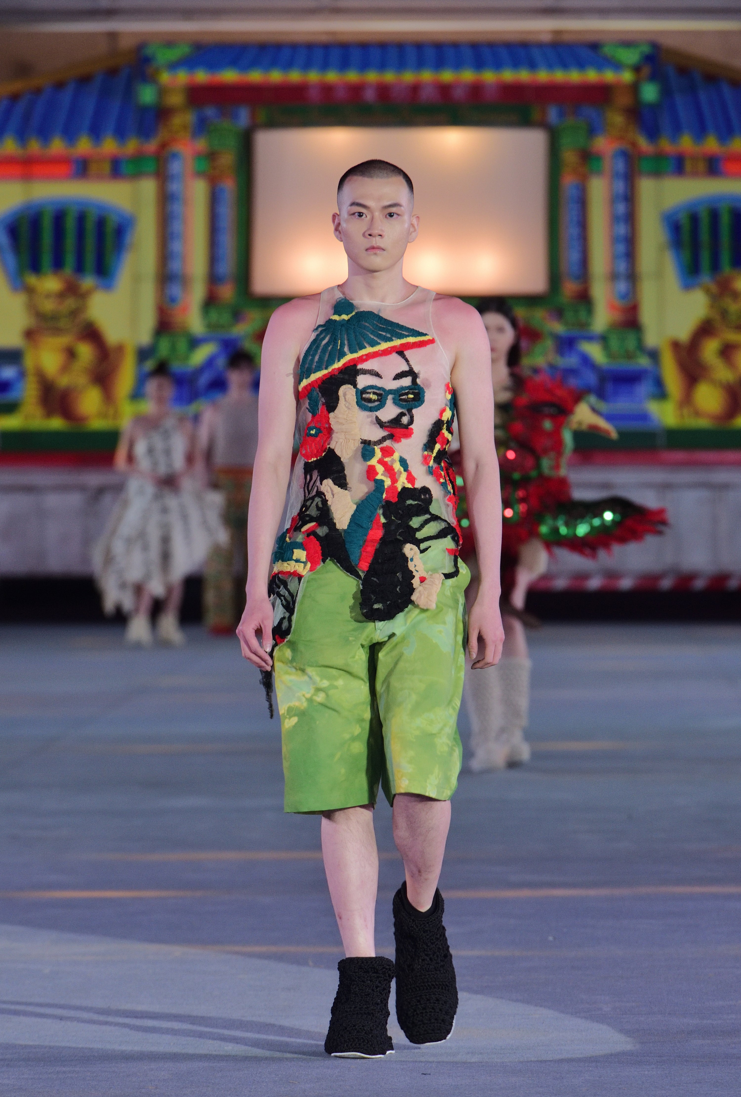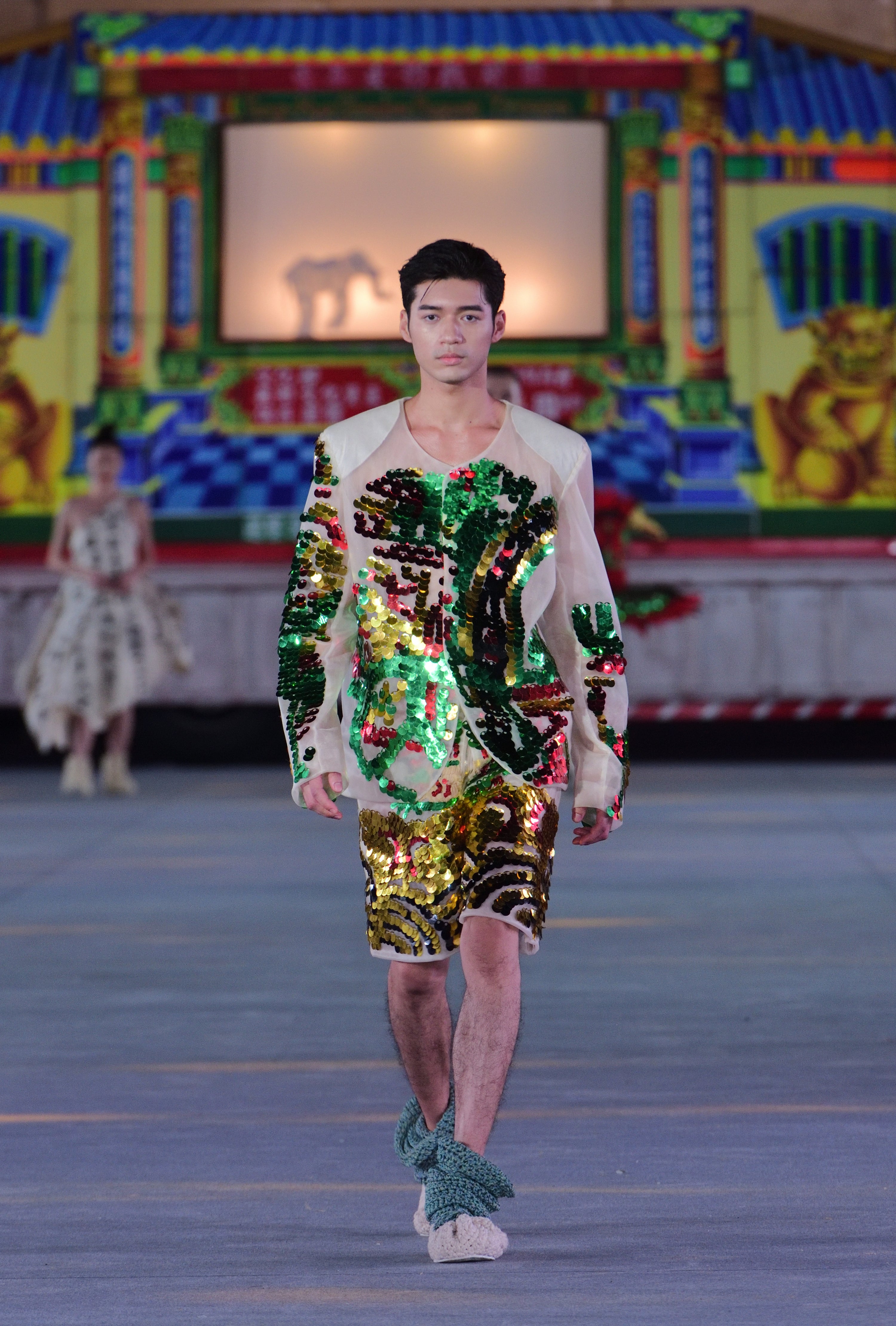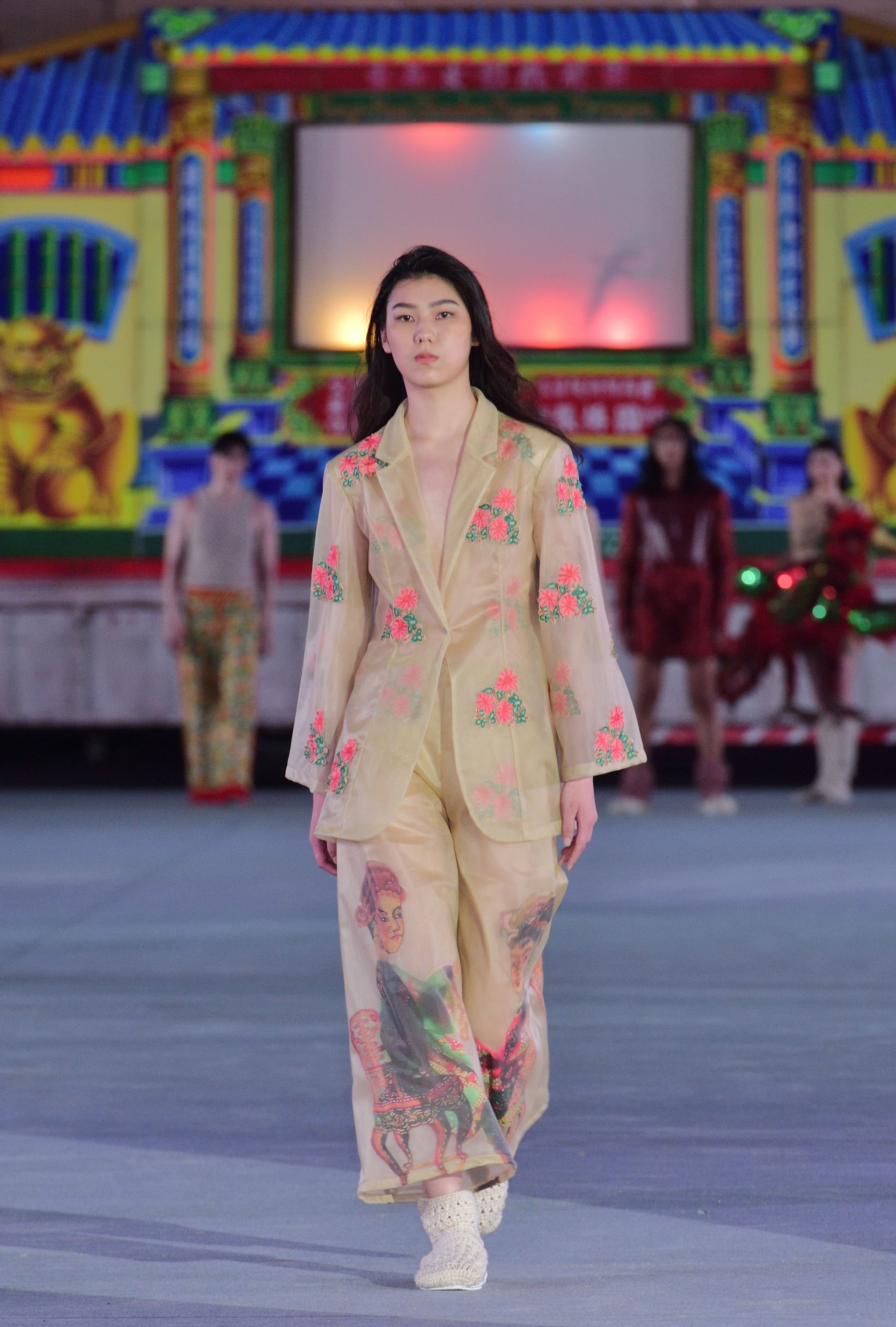 以東華皮影戲團八十年老劇本(孫悟空大鬧天宮、西遊記-金兜山獨角青牛)、角色(生、旦、淨、末、丑)、雕刻技法、色彩及演出影像為靈感元素,透過當代服裝設計,將其解構、編排及重組,又以皮影戲的牛皮經時間氧化後的米黃色及紅、綠、黑為主要色彩,表現光影、漸層、暈染的迷幻視覺效果,重新詮釋皮影戲工藝傳承、故事、懷舊、童趣及樸實的形象。