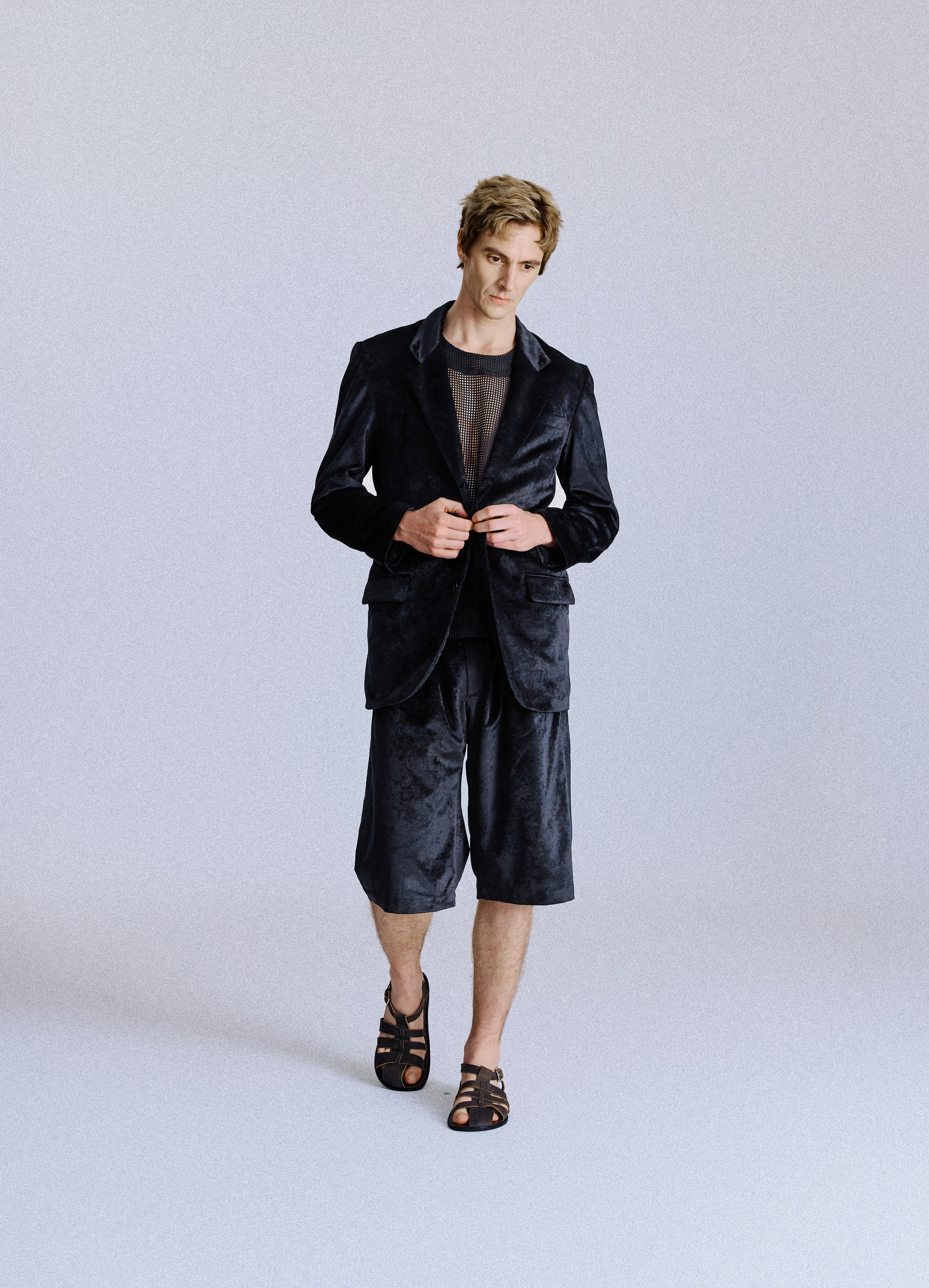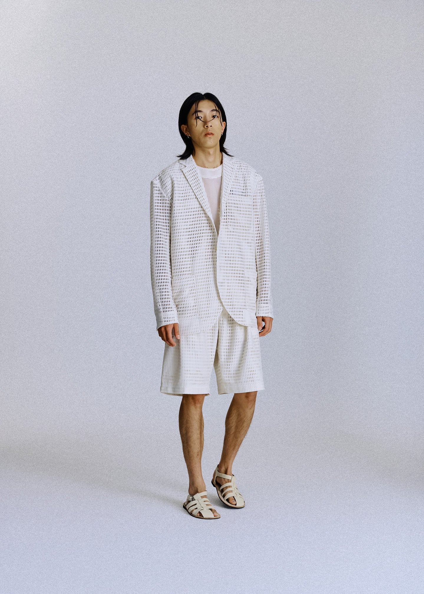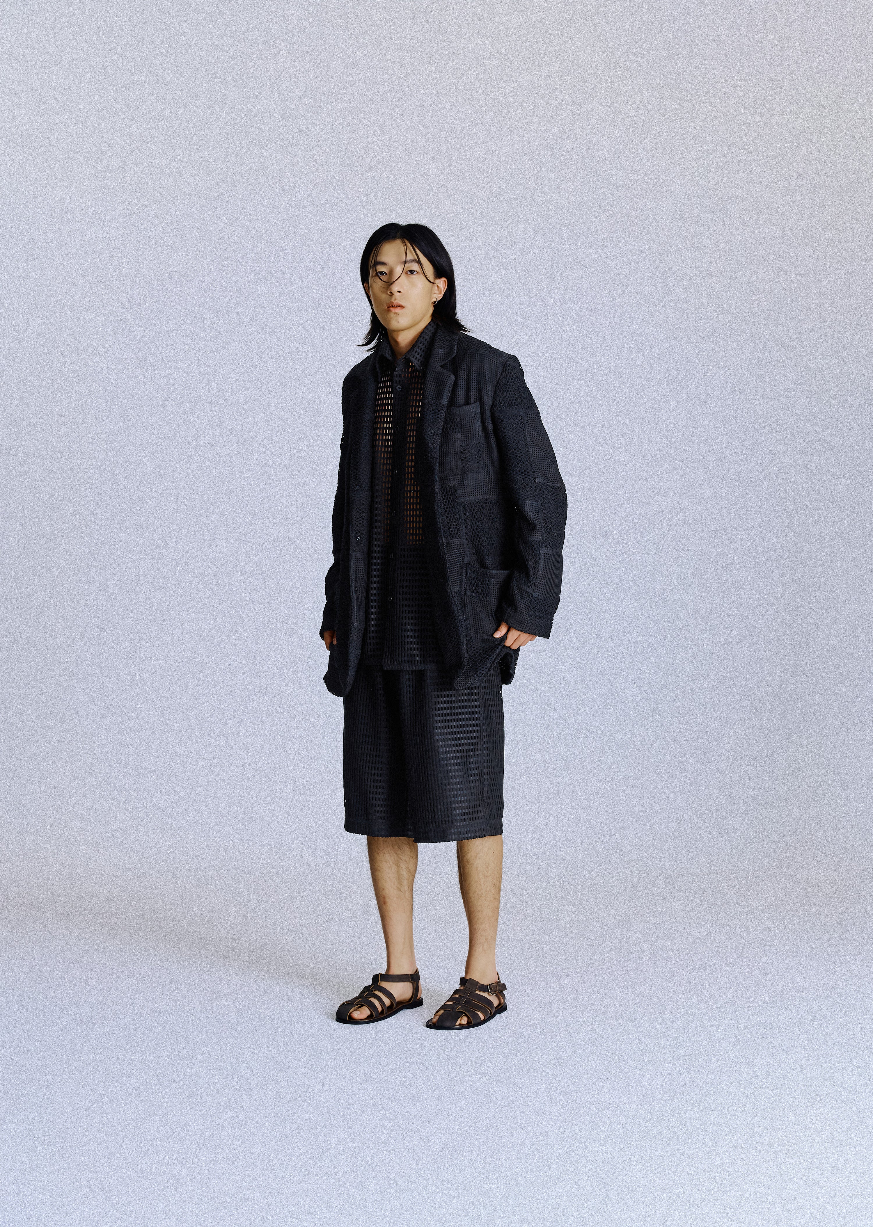 Between light and shadow, between body and fabric, between being clothed and unclothed, there exists a subtle, almost imperceptible “form between”. This season, TANGTSUNGCHIEN’s SS26 menswear collection explores the coexistence of form and airthrough perforated mesh, flocking, and delicate jacquard fabrics. Garments are no longer merely coverings—they become mediums that allow skin and air, structure and softness to exist together, light yet resolute.
