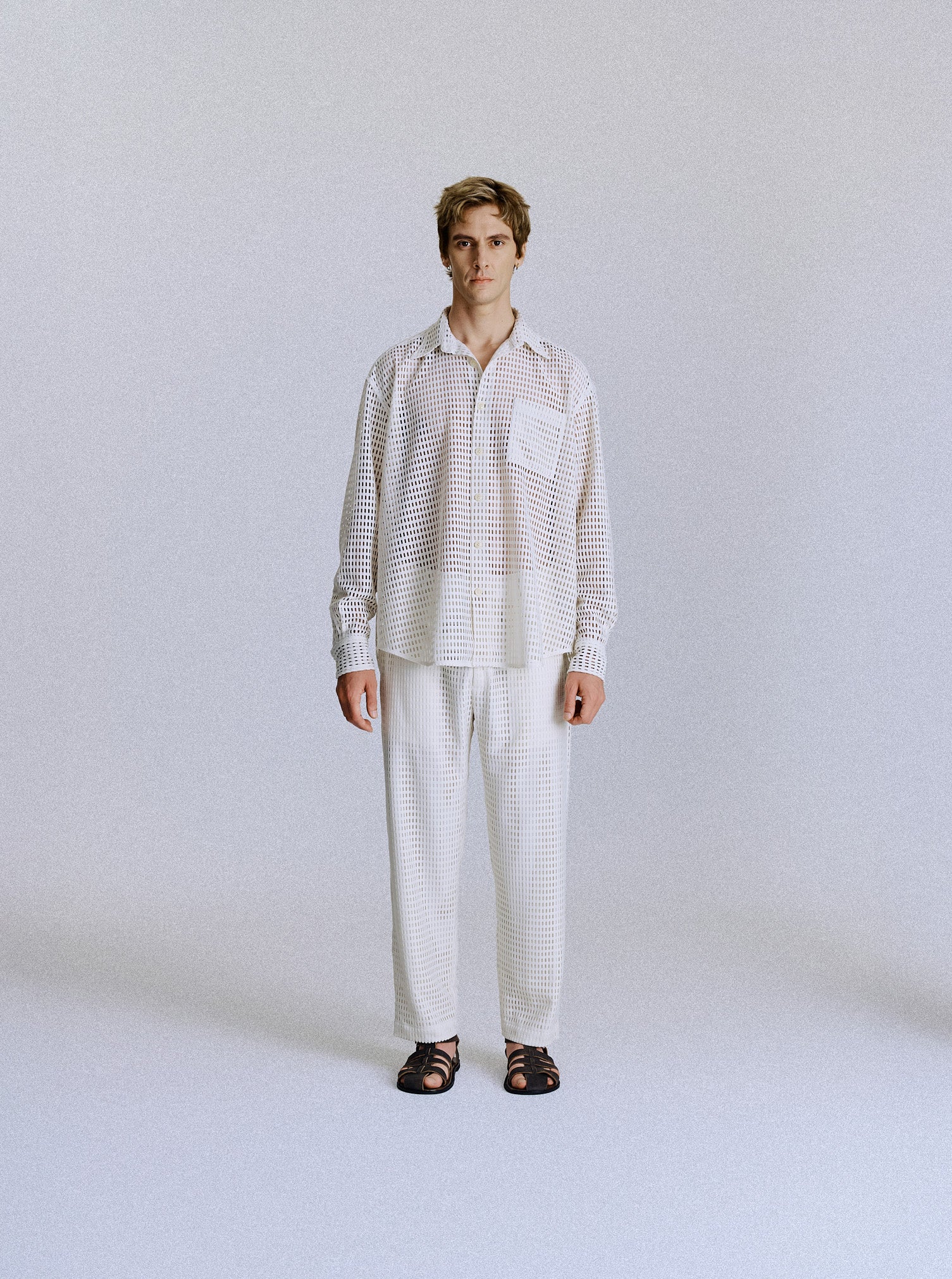 本系列以建築中的「空」為起點,模糊身體與空間、內與外的界線。長版襯衫、解構式西裝、通透的短袖上衣與柔和剪裁的長褲,以層疊的造型重建穿著者與世界的關係。有些單品保留明確的結構線條,有些則讓身體自由流動,如空氣穿過窗花之間的縫隙。