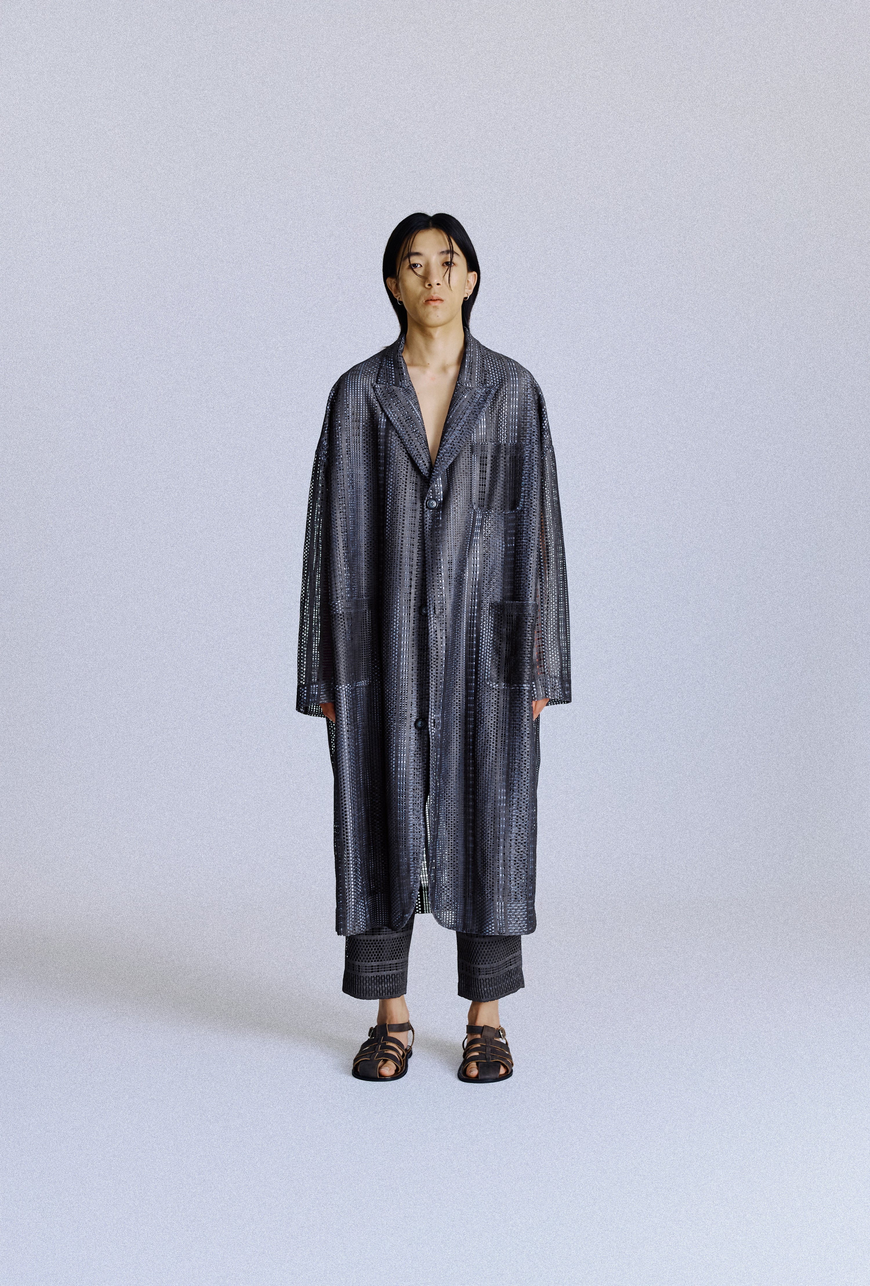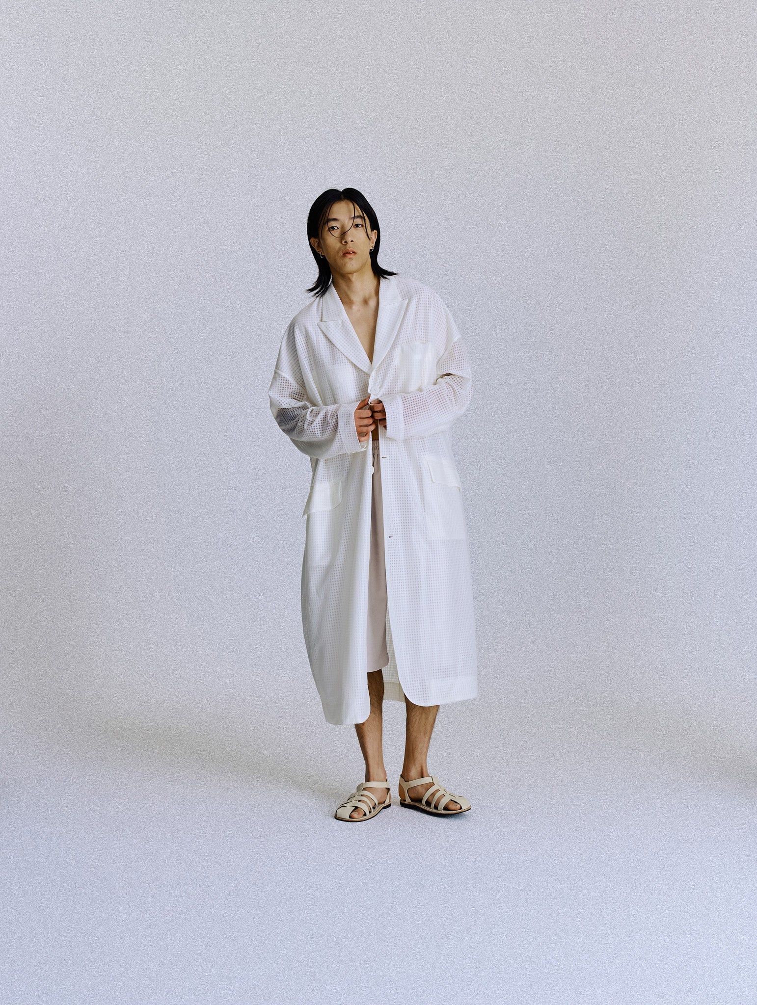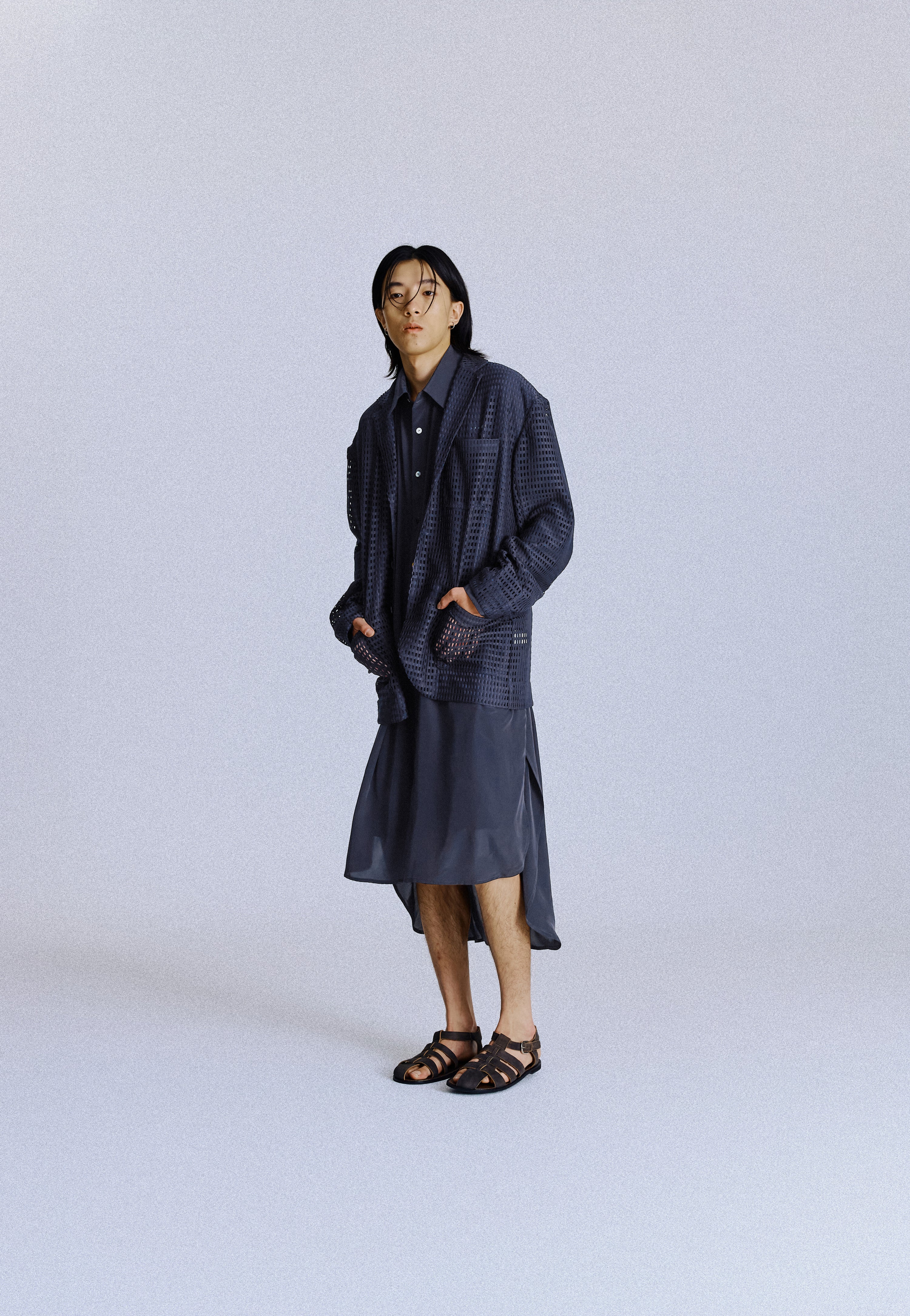 在光與影之間,在身體與布料之間,存在一種微妙且幾乎難以察覺的「透間之形」。TANGTSUNGCHIEN 2026 春夏男裝系列,以鏤空網布、植絨與細緻提花布料為媒介,探索形體與空氣共存的可能。服裝不再只是覆蓋身體的工具,而是讓肌膚與空氣、結構與柔軟並存的載體,輕盈卻堅定。