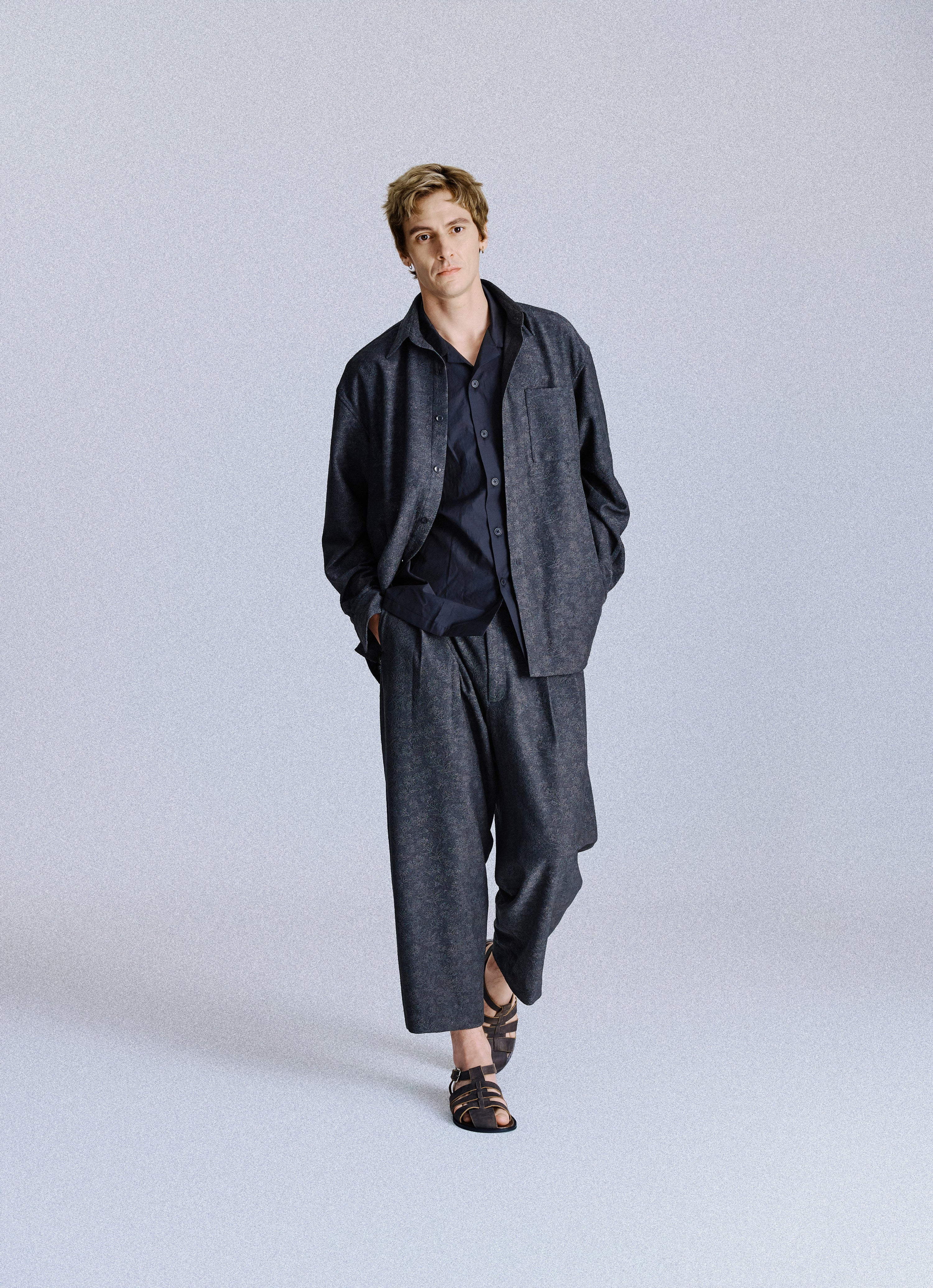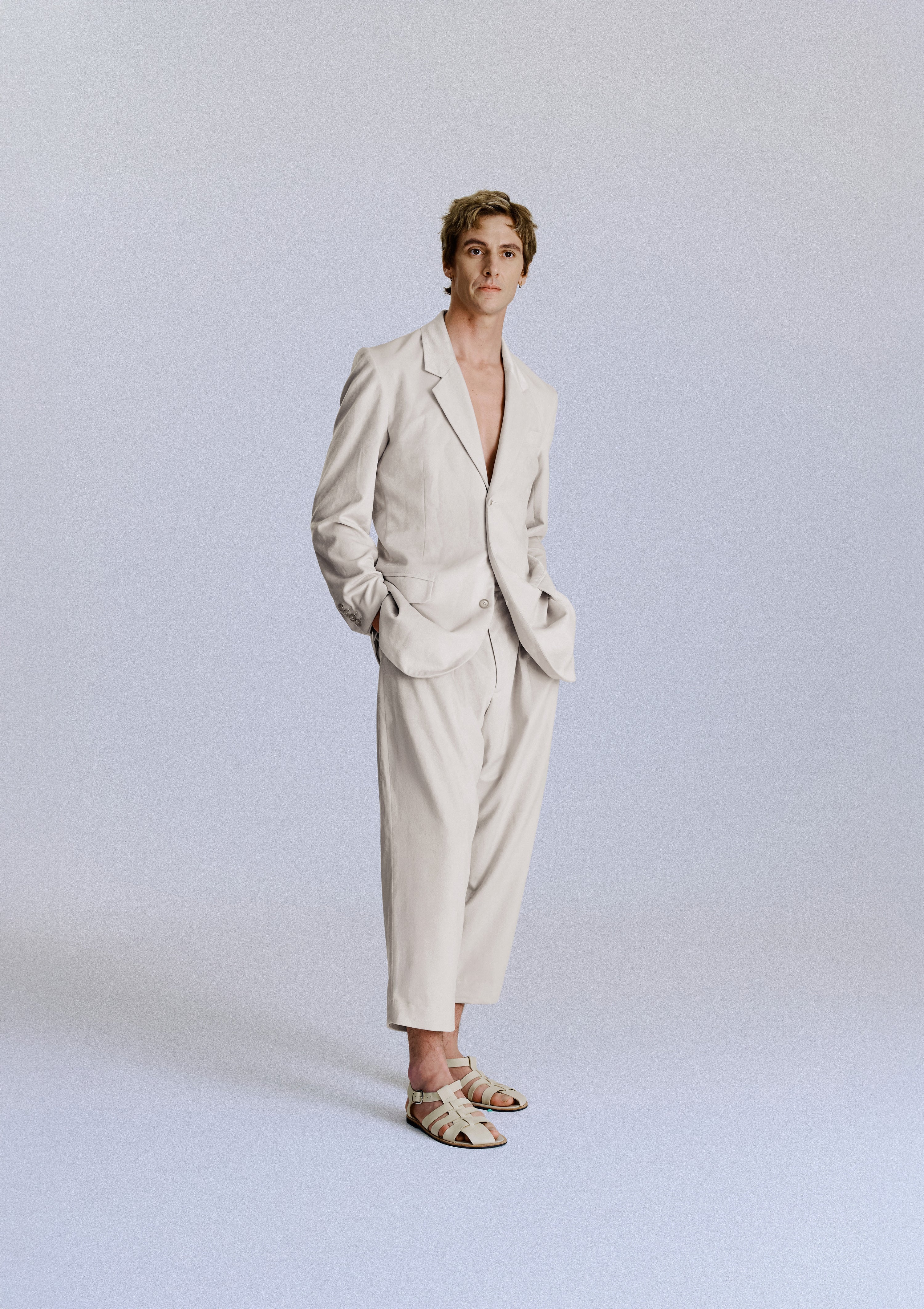 The collection begins with the idea of emptiness within architecture, blurring the boundaries between body and space, interior and exterior. Long shirts, deconstructed suits, airy short-sleeved tops, and softly tailored trousers reconstruct the wearer’s relationship with the world through layered forms. Some pieces retain structural lines, while others allow the body to move freely, like air passing through a window grille.