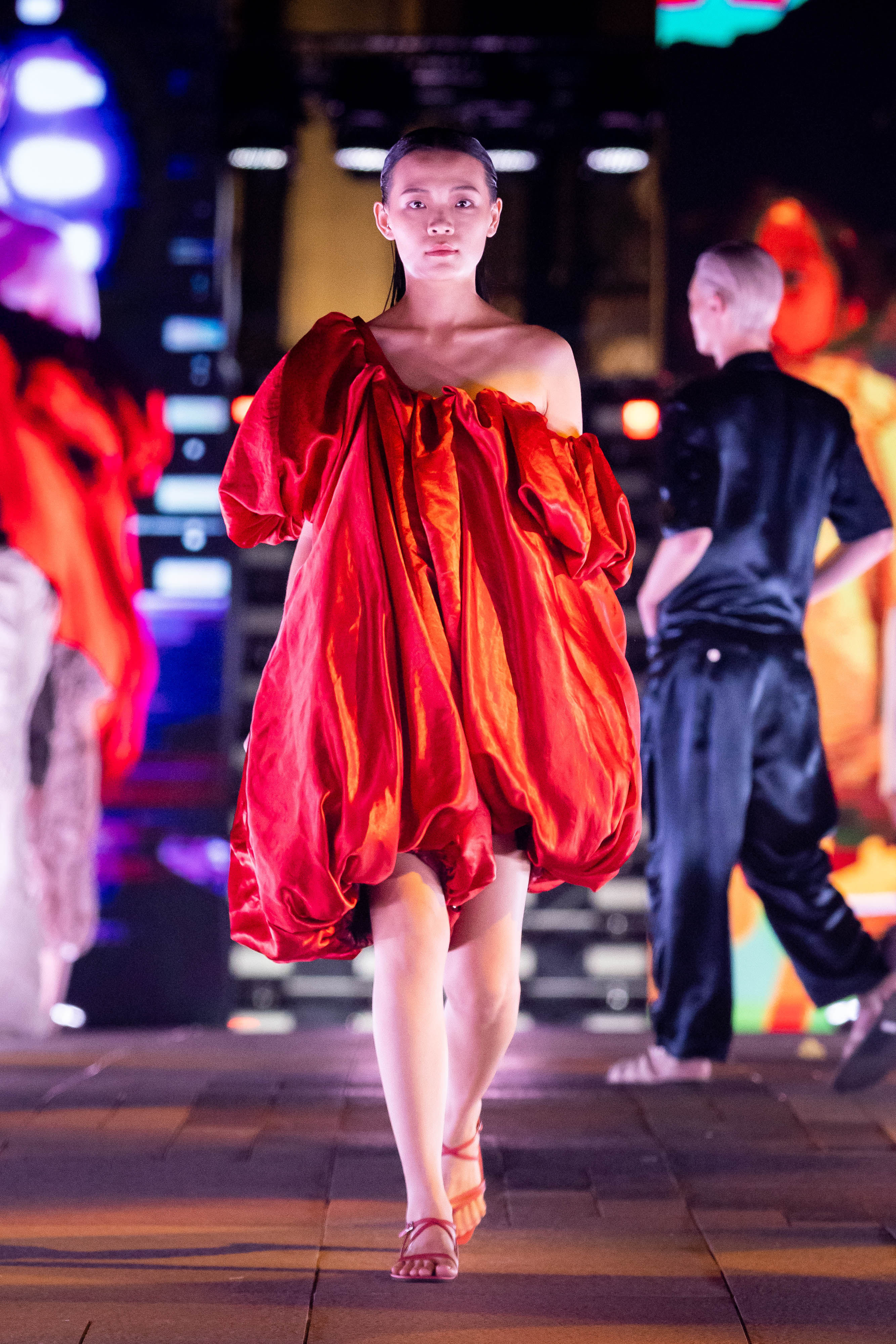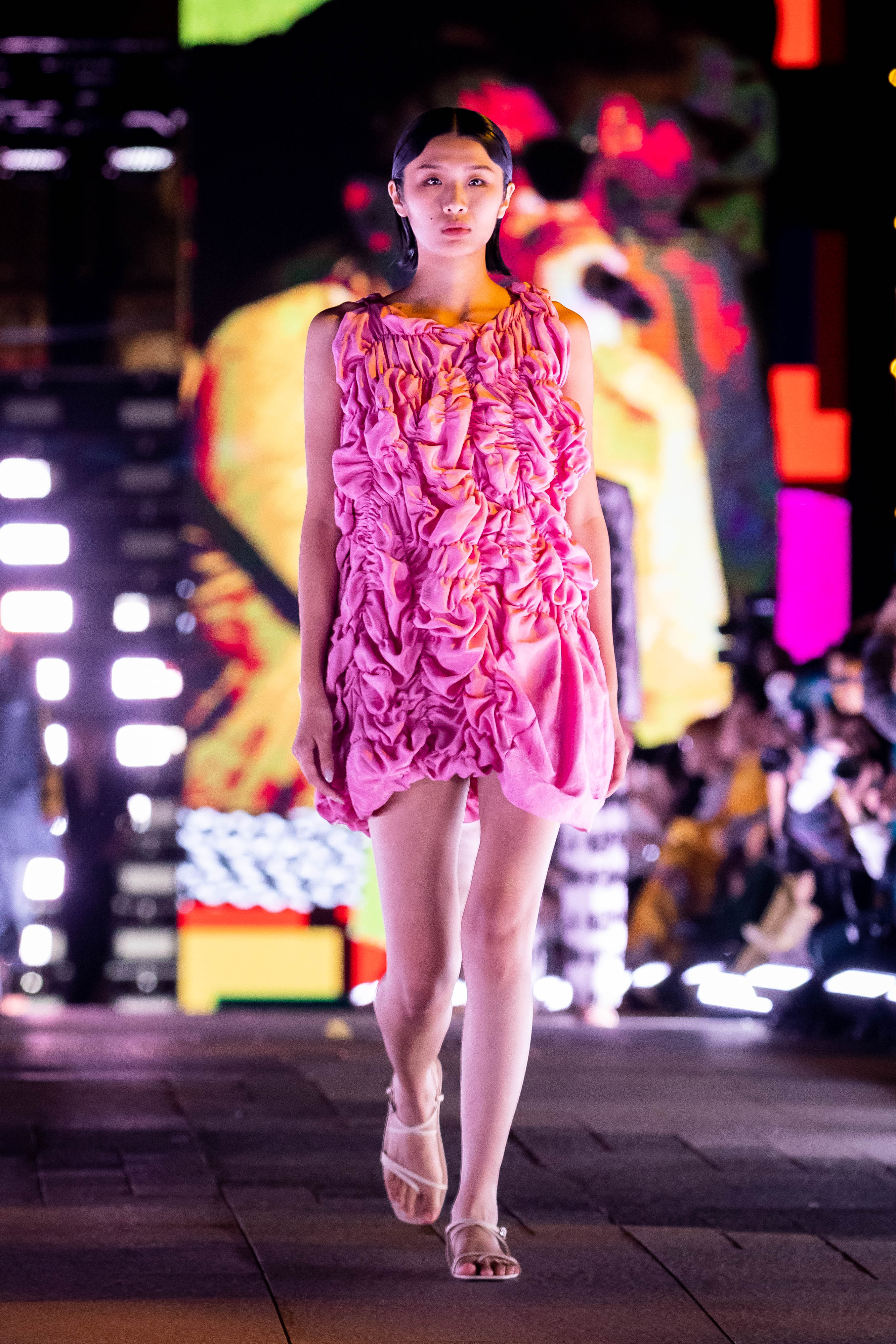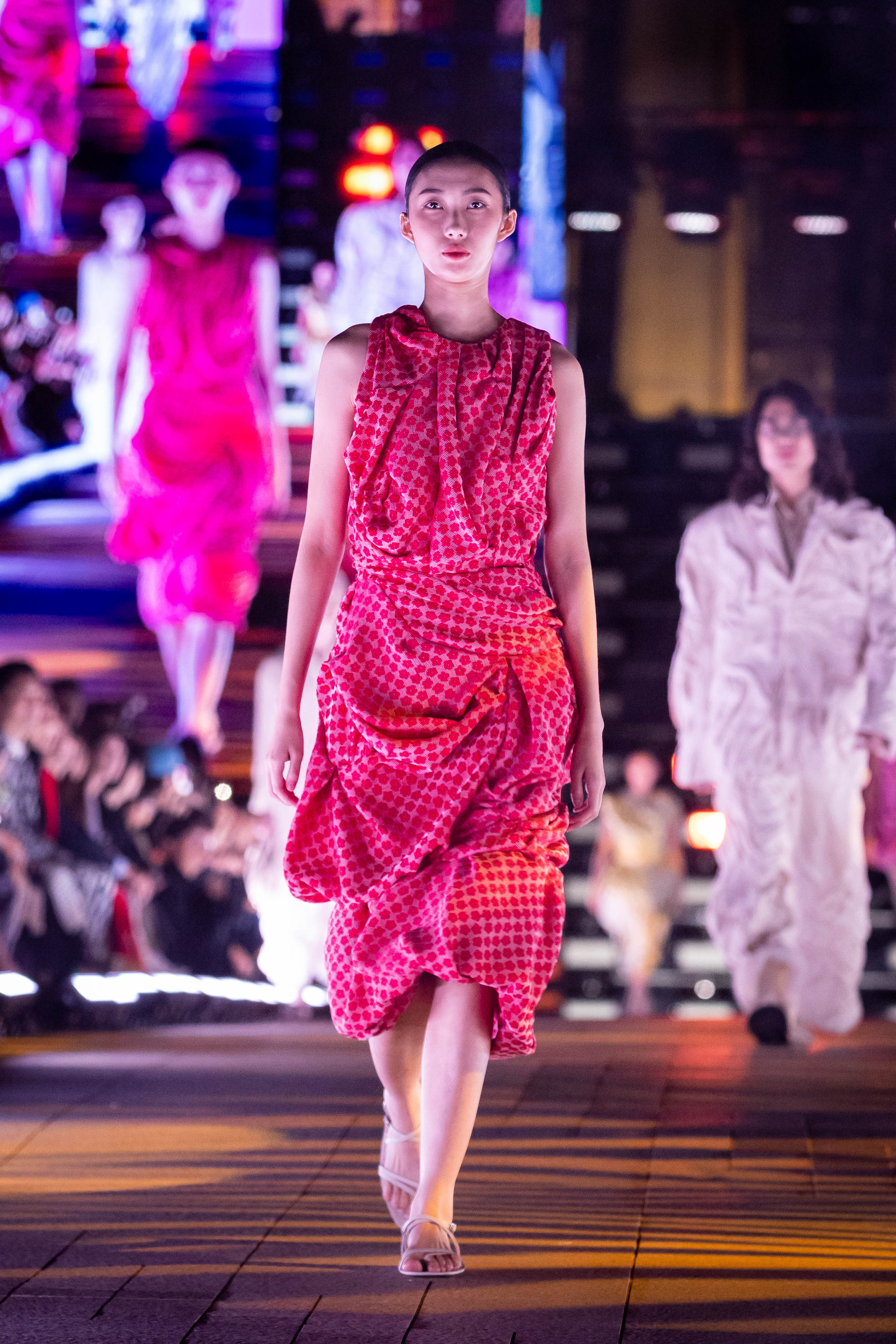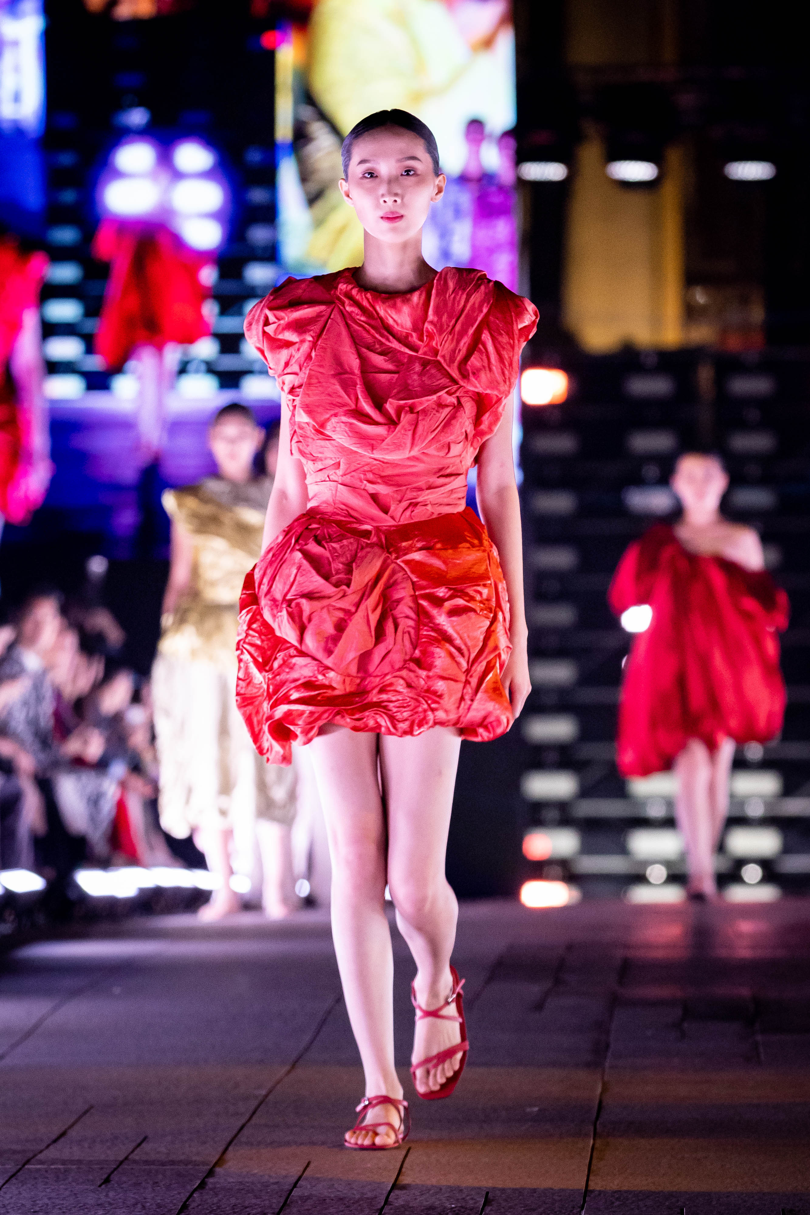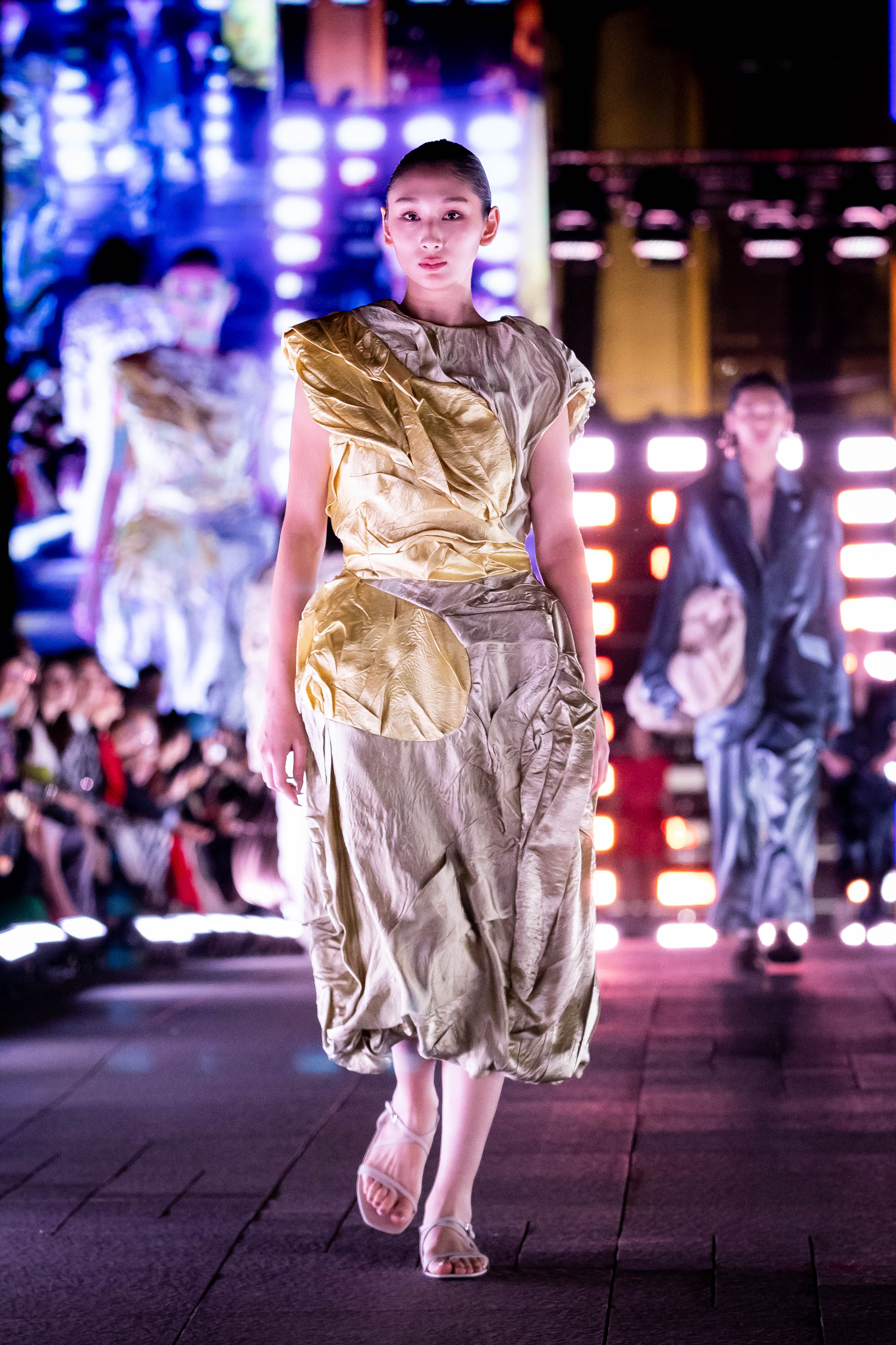 如何以下對立的概念用物質表達:融合與衝突、平衡與不平衡、對稱與不對稱、完成與未完成、增加與消除、建構與解構,使用抽皺、抓摺、拼接、等等技法和布料及材質特性、色彩、及印花表現出其獨特的質感。來創造新的身體、新的肌膚,以此質疑什麼是完美的身體,什麼是完美的肌膚?什麼是美麗,什麼是醜陋?什麼是「正常」的?