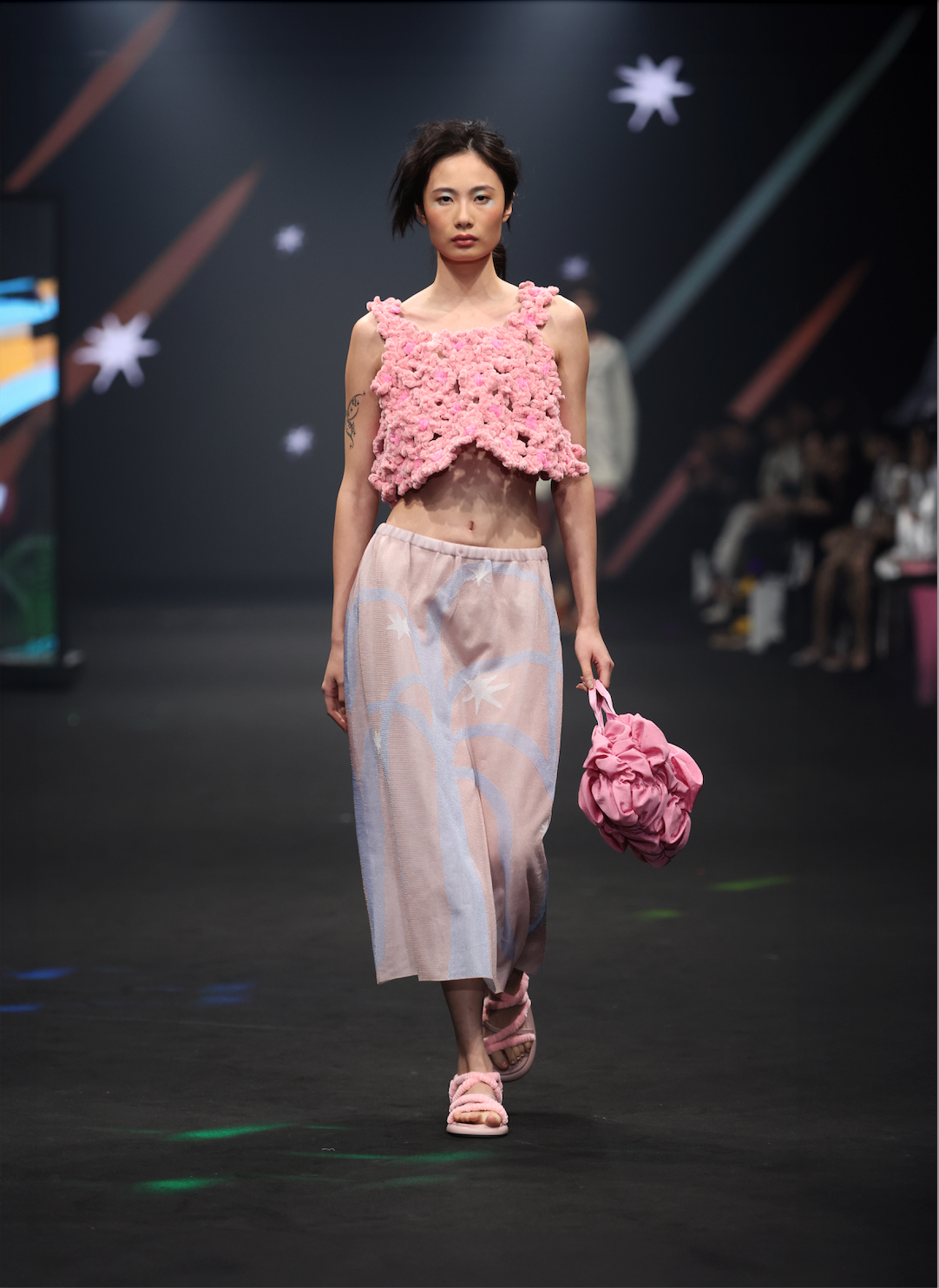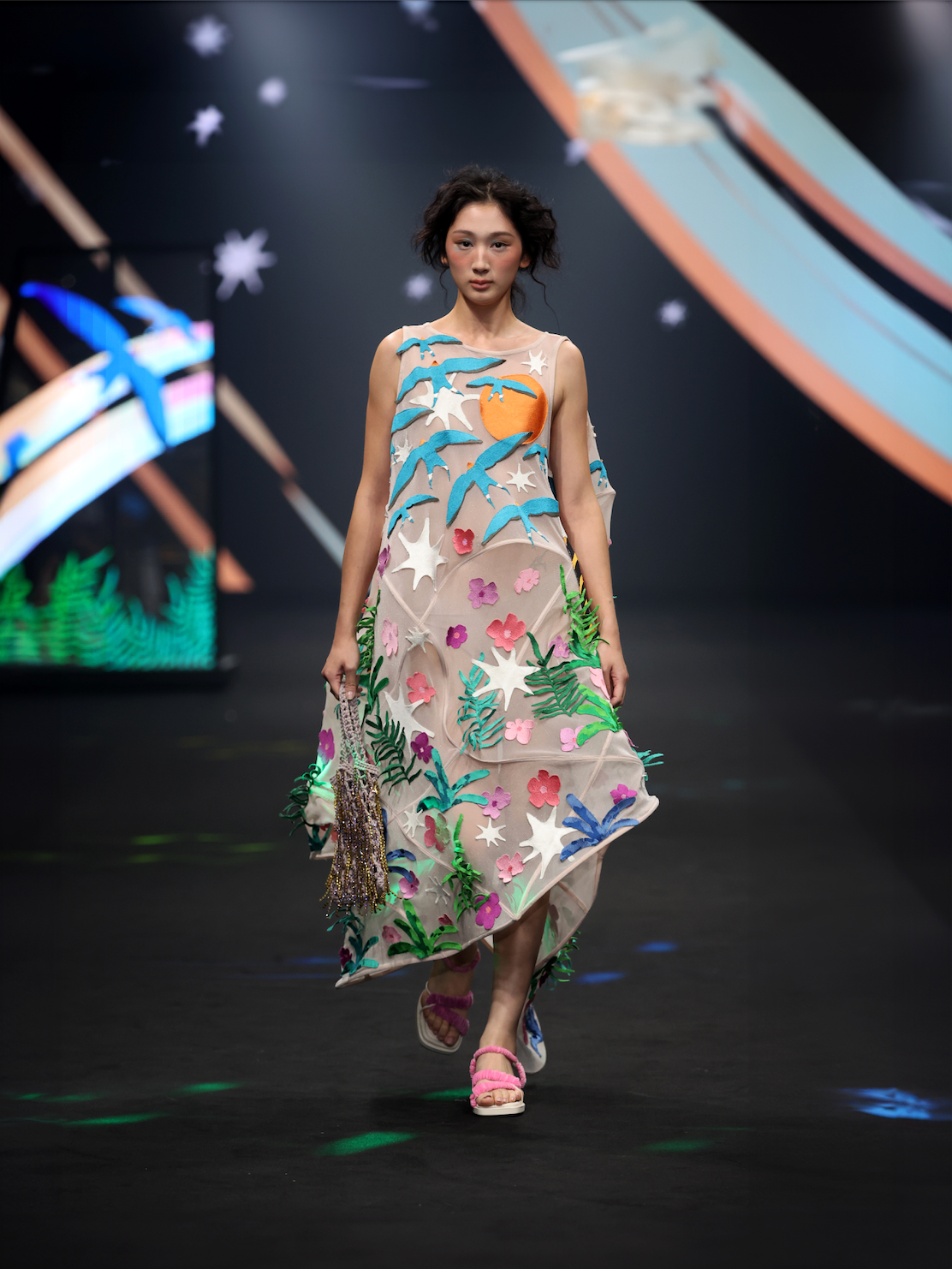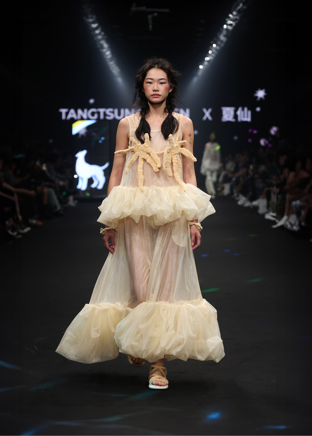 TANGTSUNGCHIEN SS25 以「夏仙」畫家故事性的圖像為靈感,設計出既現實又充滿奇幻、詩意色彩的服裝系列:慵懶的造型、童趣、療癒的圖形及色彩,探索不同的質感和材料,將插畫中的色彩和紋理實現在布料上,呼應畫家「最美好的日常」原作,增強設計的層次感,形成獨一無二的視覺效果。臺灣特有的自然景觀與城市風景:太陽、燕子、蕨類、山景、電線桿、雜草堆、小狗等等,融合具有這些主題特徵的版型設計,透過剪裁和顏色呈現故事情節的不同層面,打造一系列充滿活力和個性的風 格服裝。服裝版型融合了當代文化元素,表現臺灣都市文化和年輕人的精神。